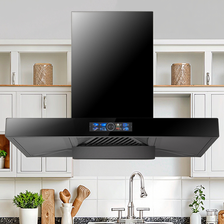 유럽 스타일 900mm T 형 3 캐비티 알루미늄 주방 레인지 후드 벽걸이 형 유리 입구 가정용 오일 배기 호텔 가정
